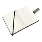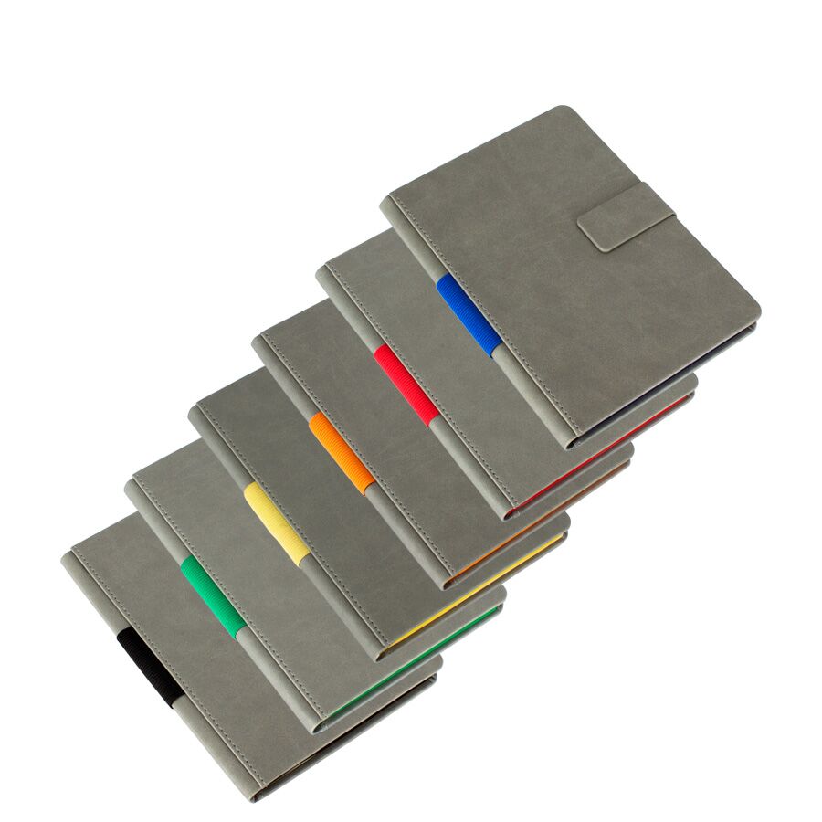 Cuaderno tamaño A5, con tapas duras forradas en PU gris, con cierre hebilla imantada, con 96 hojas amarillas lineadas de 80 gsm. Contiene detalles de color en lomo de hojas y porta-bolígrafo elasticado.
