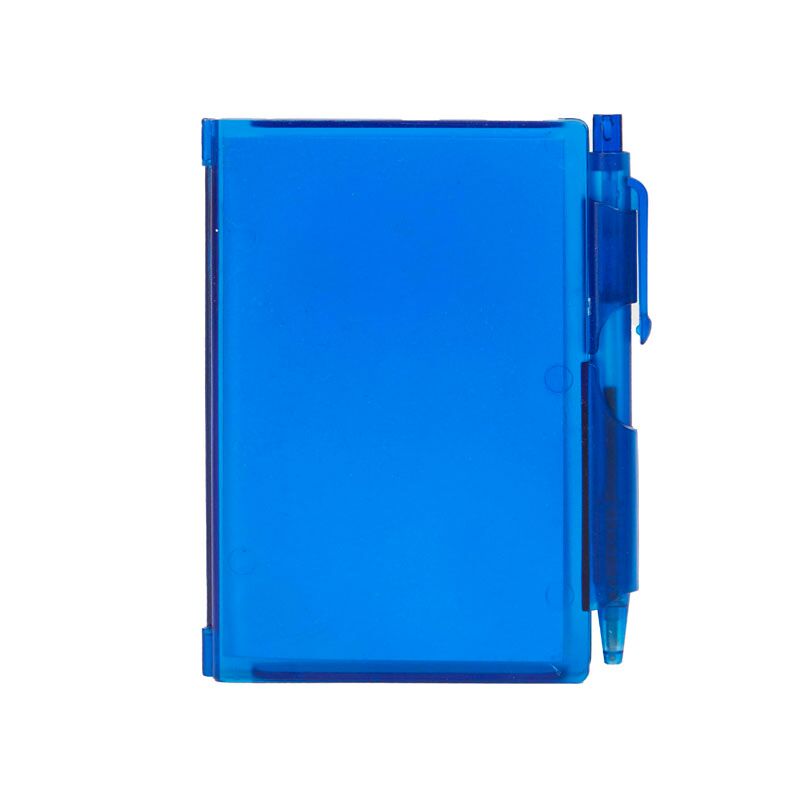Cuaderno Plástico con tapa dura de PS y porta bolígrafo. 80 hojas lisas. Medidas: 10,4 x 7,8 cm. Tahg