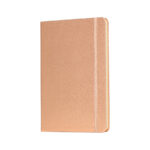 Cuaderno tamaño A5, con cubierta de cartón piedra forrada en PU color cobre de 1.5mm de espesor, interior 80 hojas amarillas lineadas de 80 gsm. Incluye banda elástica y huincha separador de hojas al tono. Presentación individual en bolsa de polipropileno translúcido.