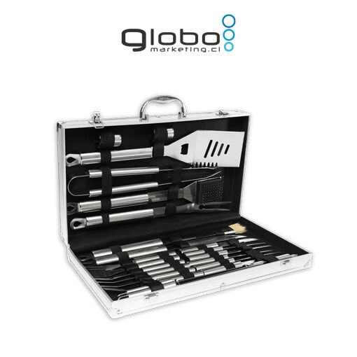 Deluxe BBQ set de asado en caja metálica. Incluye 24 herramientas de asado 100% acero inoxidable. Interior recubierto en tela ecológica negra. Manilla y cierres metálicos. Incluye placa metálica rectangular para grabar logo. Presentación bubble-bag.