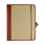 Deluxe Carpeta ejecutiva modelo “Windsor” en Eco-Cuero café y polyester café claro. Incluye bolsillo delantero. En el interior contiene Block de 20 hojas lineadas color beige, Bolsillo grande para documentos, Bolsillo con Cierre, Porta-Bolígrafo y Compartimentos para Tarjetas. Forrada en fina tela escocesa.