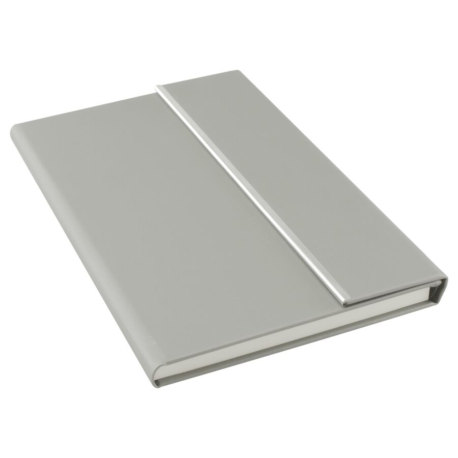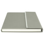Cuaderno tamaño A5, cubierta de Termo-PU gris, con cierre traslape magnético y banda metálica plateada. Interior 80 hojas lineadas amarillas de 80gsm. Presentación individual en bolsa de polipropileno.