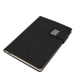 Deluxe Cuaderno tamaño A5 modelo “KEVIN”, con tapas de Termo-PU negro mate de 650gsm, con 80 finas hojas amarillas con punteado “mental”. Contiene cierre metálico imantado. Y banda separador de hojas color negro.