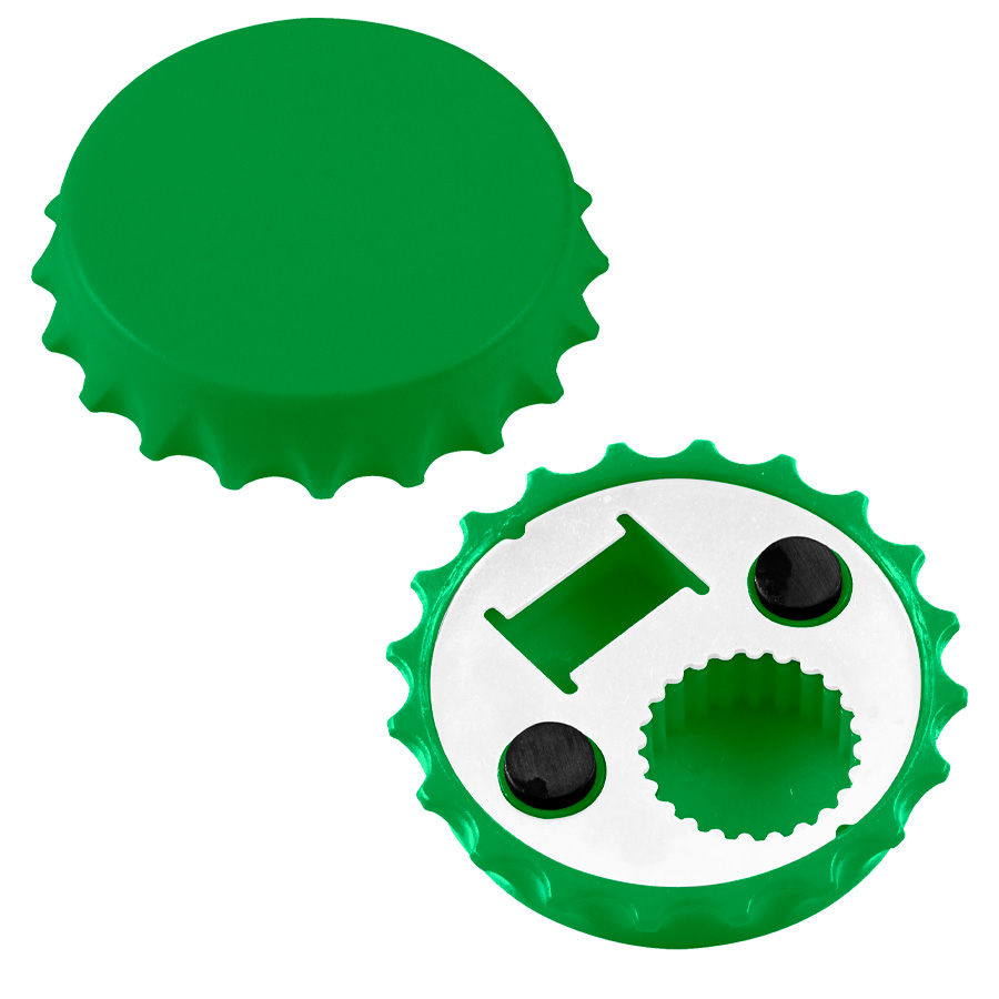 Destapador y Abridor de tapas twist-off, con forma de tapa de botella. Imantado para refigerador.
