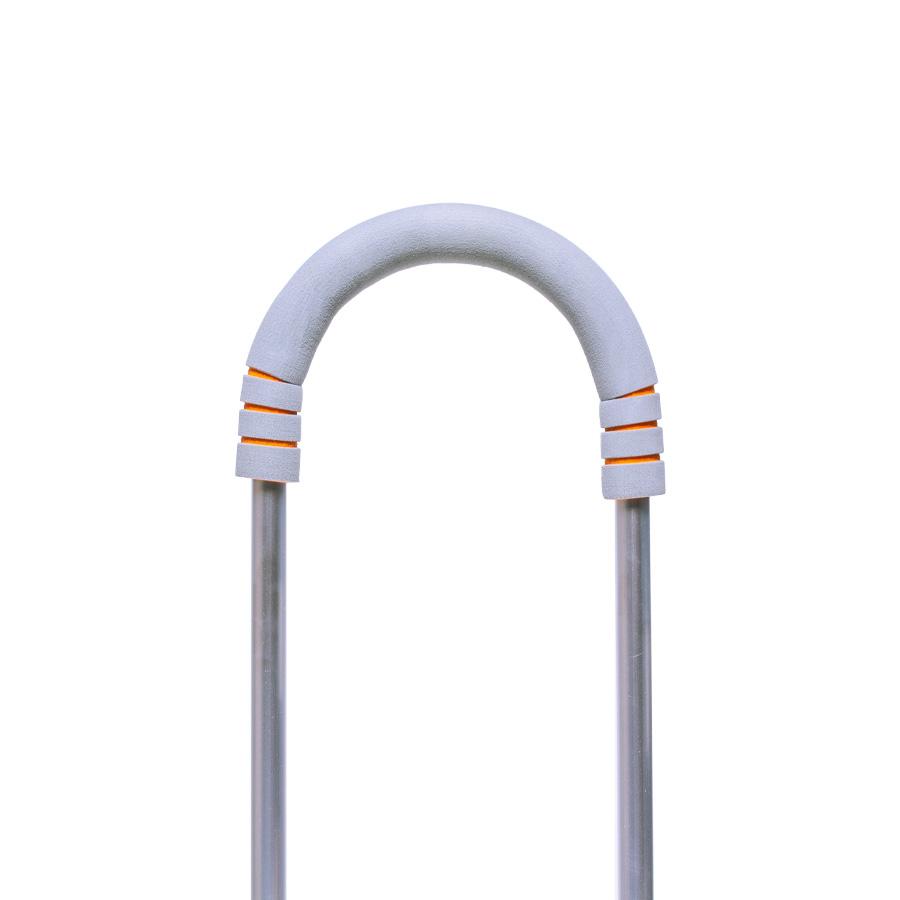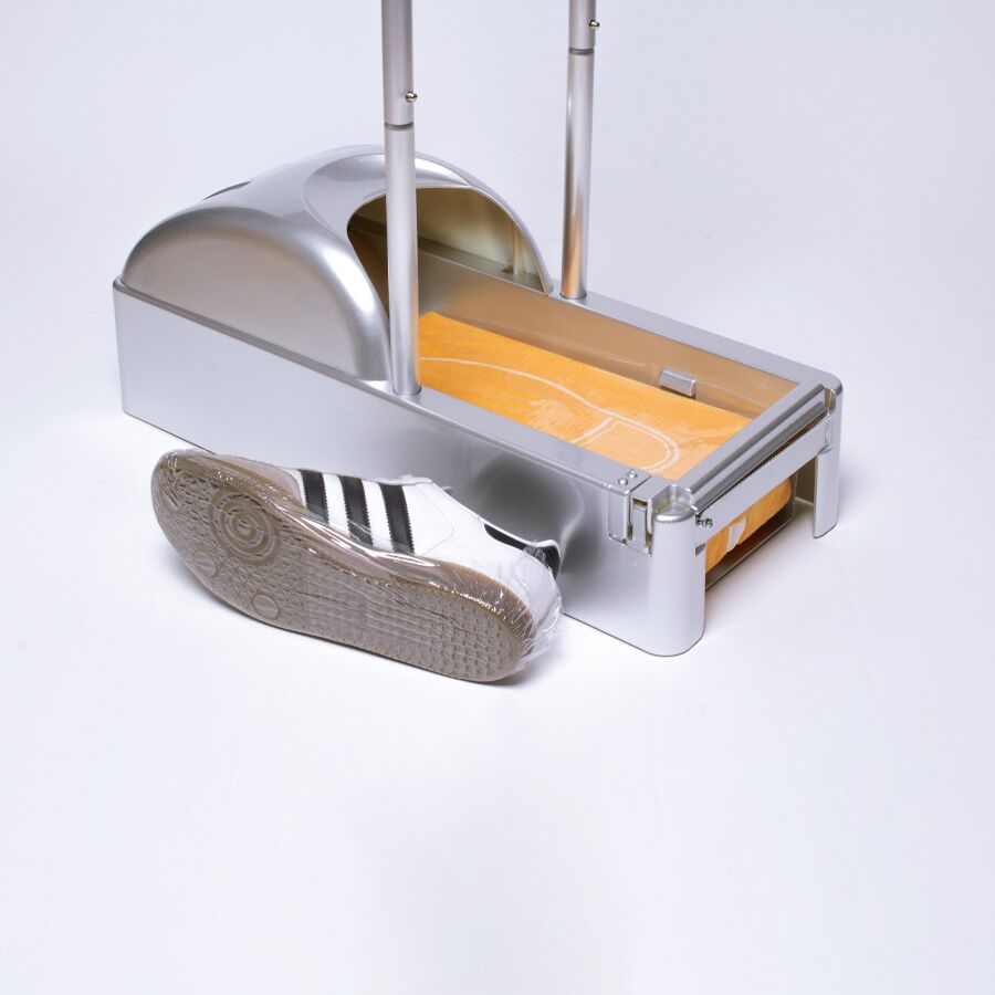 Dispensador de plástico ABS con estructura metálica, para Cubre-Calzado industrial. En cada pisada, entrega cobertor filom plástico PE adherente, ideal para mantener el calzado protegido de virus y bacterias en ambientes protegidos. Cuenta con soporte de apoyo manual de 65cm de altura. En el interior de debe instalar un rollo de film plástico PE protector (R18), que se adhiere a la planta del calzado en forma automática en cada pisada dentro del dispensador.