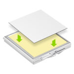 Espejo metálico cuadrado doble, con tapa, con cuadrado para Sublimación. Presentación en caja laminada blanca.