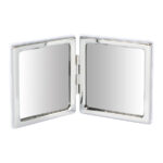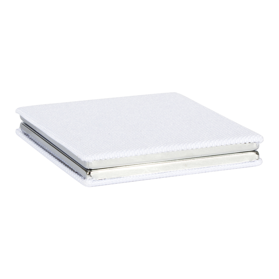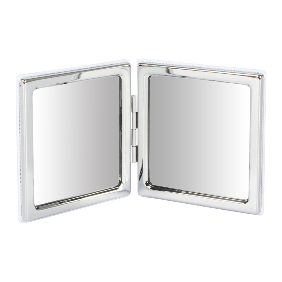Espejo metálico cuadrado doble, con 2 tapas exteriores recubiertas en poliéster color blanco, para Sublimación. Contiene un espejo normal y el otro con aumento. Sistema de cierre magnético. Presentación en bolsa PP translúcido.