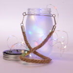 Farol para colgar, con forma de frasco y con tapa. Incluye cable con luces LED en el interior, que cambian de color. Sobre la tapa, contiene panel fotosensor, que permite que las luces LED se enciendan automáticamente cuando baja la luz-día. Las luces permanecerán encendidas por un lapso de 3 horas aproximadamente. IMPORTANTE: el panel fotosensor NO ES PANEL DE CARGA SOLAR, es decir, la carga de las luces LED viene dada por una pila AAA común (no incluída) y la función del panel fotosensor es encender las luces una vez que detecta una baja importante en la luz de día.