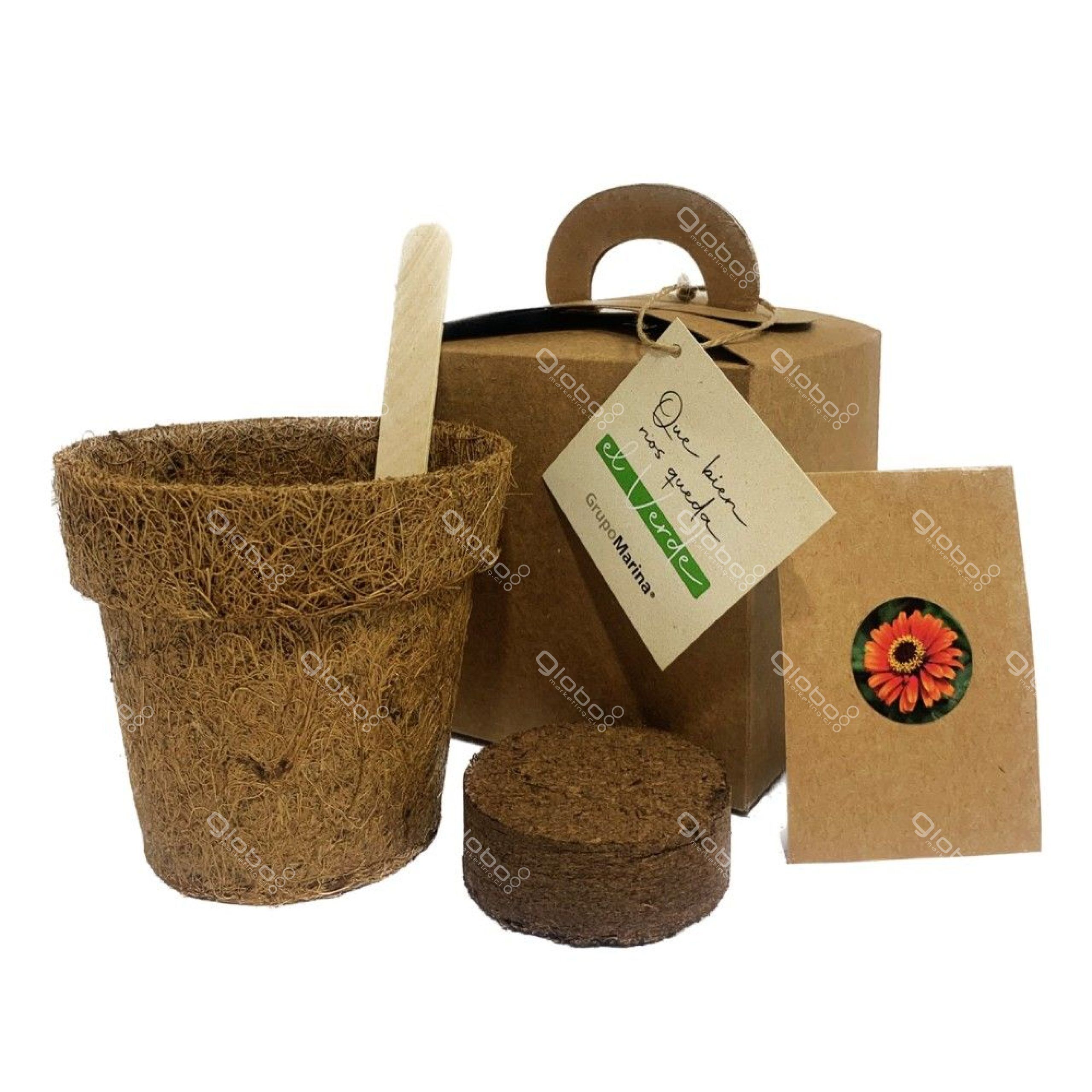 -1 macetero de turba vegetal biodegradable 8 x 8 x 5 cm (220 cc) -Comprimidos de “Tierra Mágica” -1 sobre con semillas (variedades a elección según temporada) Hierbas Aromáticas/Huerto/Flores -Instrucciones de siembra -Bolsa de crea-algodón (18 x 24 cm) -Etiqueta cartulina Kraft o blanca impresa con diseño/logo entregado por el cliente (6 x 6 cm) -Amarre con cordel de yute. Opcional: Bolsa impresa a 1 color en serigrafía con logo/diseño (mínimo 100 unidades)