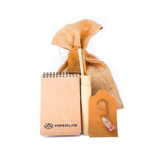 -1 libreta ecológica de 10 x 15 cm (70 hojas) tapa cartulina Kraft 400 gr, papel caña de azúcar, impresión color logo en la tapa exterior.
