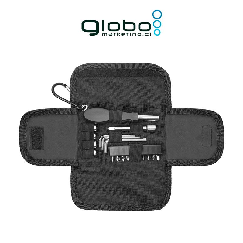 15 x 9,5 cm (cerrado) 15 x 23,5 cm (abierto). Acero y plástico. Set de herramientas de 19 piezas. Destornillador con 10 puntas diferentes, 3 llaves Allen, 4 llaves tubo de 4 medidas y alargue. Estuche con cierre de velcro y gancho.