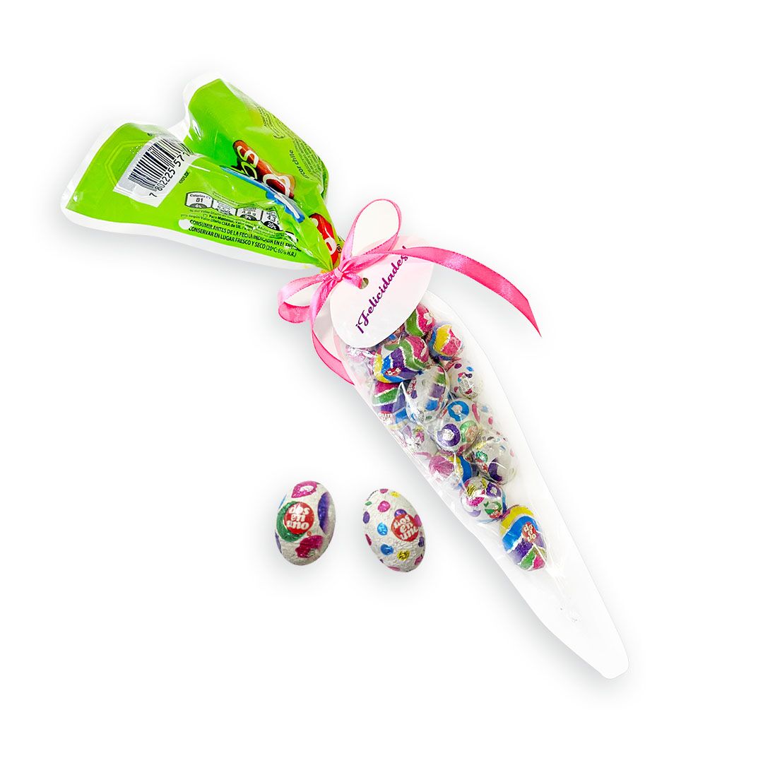 Huevitos de chocolate en bolsita con forma de zanahoria.