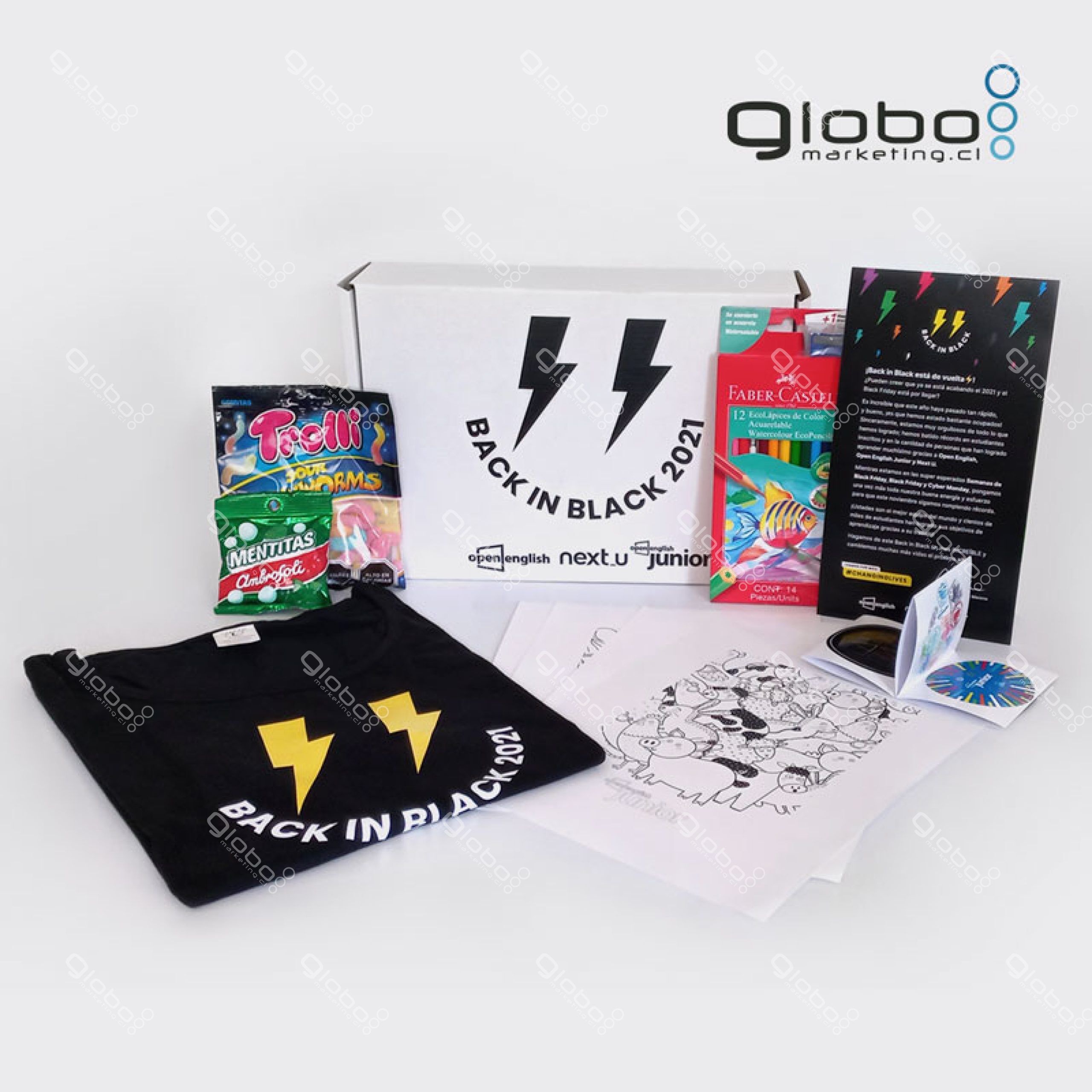 Presentación del pack en caja Kraft blanca con dulce a elección y Set de entreteniendo. Polera 100% ALGODÓN pre-lavado de 180gr/m2. Cuello redondo, manga corta.