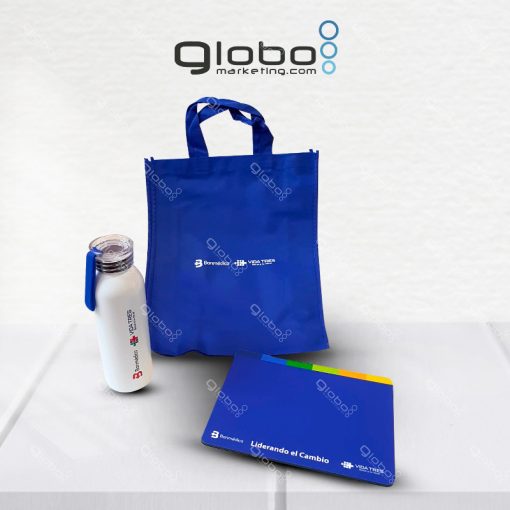 Este kit está formado por: una Bolsa Tnt logo impreso 1 color, Botella de aluminio, capacidad 600 ml. Logo impreso a full color, Mouse Pad