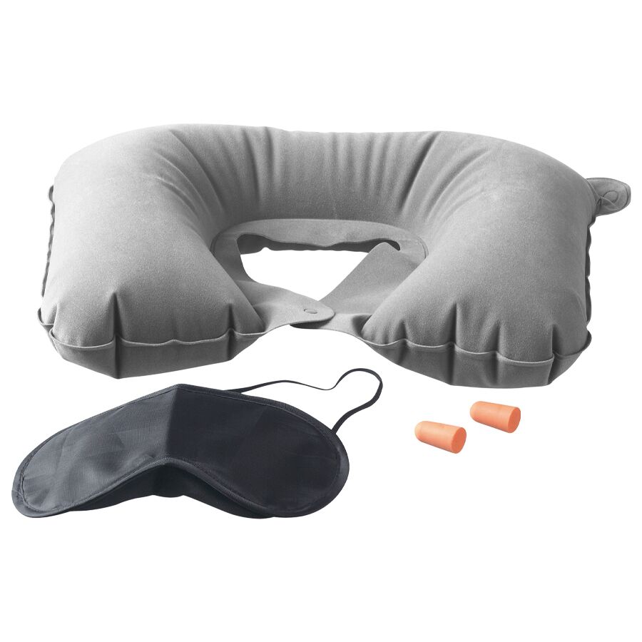Kit de Descanso para Viajes. Incluye Almohada inflable cervical en tela aterciopelada, antifaz de microfibra y tapones de EVA para los oídos. Presentación en estuche aterciopelado.