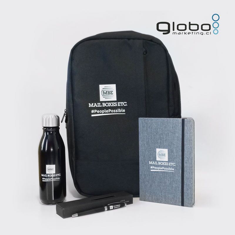 Pack iniciación para empleados, Botella ¨Chloe¨ Ø 6 (base de la botella) x 22,5 cm. Capacidad 550 ml. Aluminio. Botellas de aluminio con diferentes colores en su exterior. Tapa a rosca de color plata. Mochila porta notebook. Capacidad 14 litros aprox. Amplio bolsillo frontal con cierre lateral. Posee 2 compartimentos acolchados y forrados. El segundo compartimento contiene bolsillo para notebook de hasta 15″. Libreta Urban Notes perfecta para acompañar el día a día. Con señalador, bolsillo interno en el dorso y cierre con banda elástica. Poliéster, Cartón y Papel 14 x 21 x 1,4 cm. Bolígrafo Metálico “Milos” Metálico. Cuerpo color negro engomado. Clip, puntera y detalles en color plata.