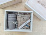 4 marcadores de plantas grabados con el nombre de las semillas.