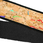 Fino lanyard porta-credencial de poliéster negro, emplacado en lámina de corcho con detalles de color. Terminación en robusto mosquetón metálico negro.
