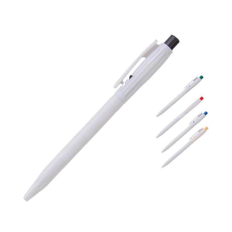 Lápiz confeccionado en ABS, de cuerpo de color blanco y clip en color. Apertura con pulsador. Tinta Negra. Tahg