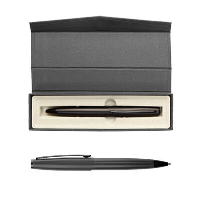 Metal. Cuerpo metálico mate. Clip de metal y punta plástica. Apertura giratorio. Con elegante estuche. Pasta azul. Destape electroplateado en la parte superior.
