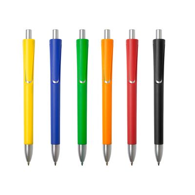 Plástico. Lápiz pasta con cuerpo plástico de color, botón pulsador y puntera color plata. Pasta negra
