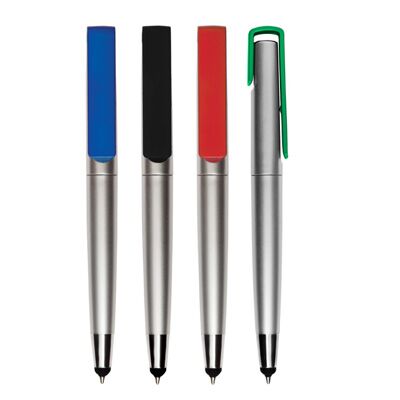 Plástico con apertura giratoria, puntera touch para pantallas táctiles. Clip plástico apto para impresión. Pasta negra.