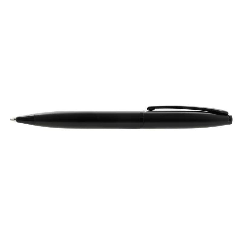 Lapiz de cuerpo metálico en acero con detalles en negro mate. Cuenta con tinta azul y apertura con medio giro. Medidas: 13,8 x 1,25 cm.