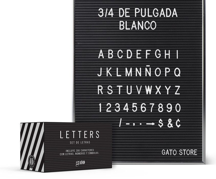 Set de 286 caracteres de 3/4 de pulgada de alto para la cartelera Letter Board. Disponible en 3 colores. Incluye letras, números y símbolos.