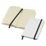 Libreta modelo “Whiteskine” tamaño A6, con cubierta de cartón piedra forrada en PU simil cuero blanco de 1.5mm de espesor. Interior 80 hojas limpias amarillas de 80gsm. Incluye banda elástica y huincha separador de hojas de color. Presentación individual en bolsa de polipropileno.