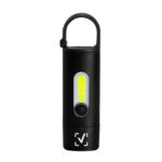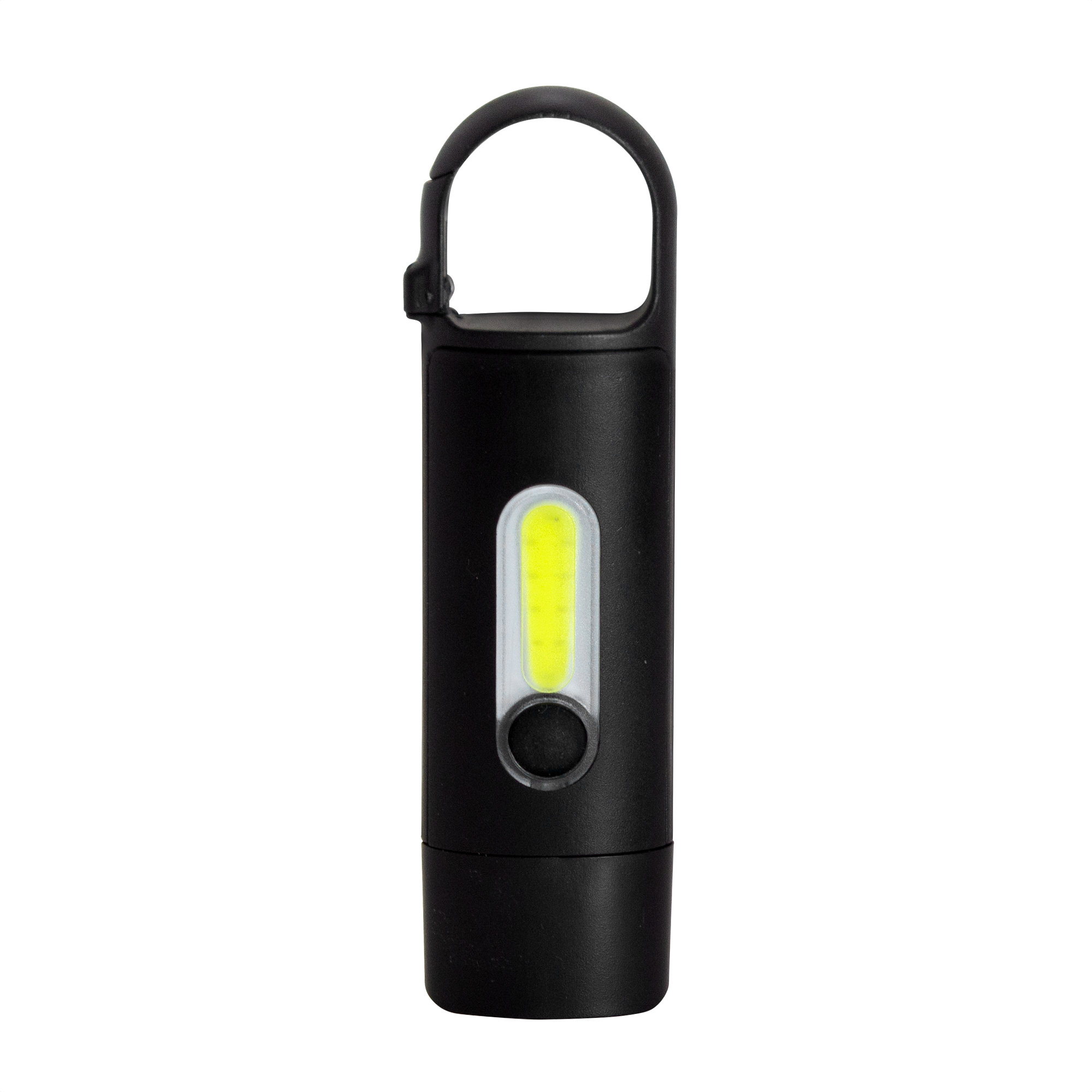 Perfecta para llevar en tu mochila.Linterna portátil recargable. Con mosquetón incorporado. Luz de emergencia y 3 intensidades de iluminación (alta, baja e intermitente). Batería recargable de 200 mAh. Puerto USB-C y cable de carga de 30 cm de largo color negro. Medidas: 11 x 3 x 1,5 cm.