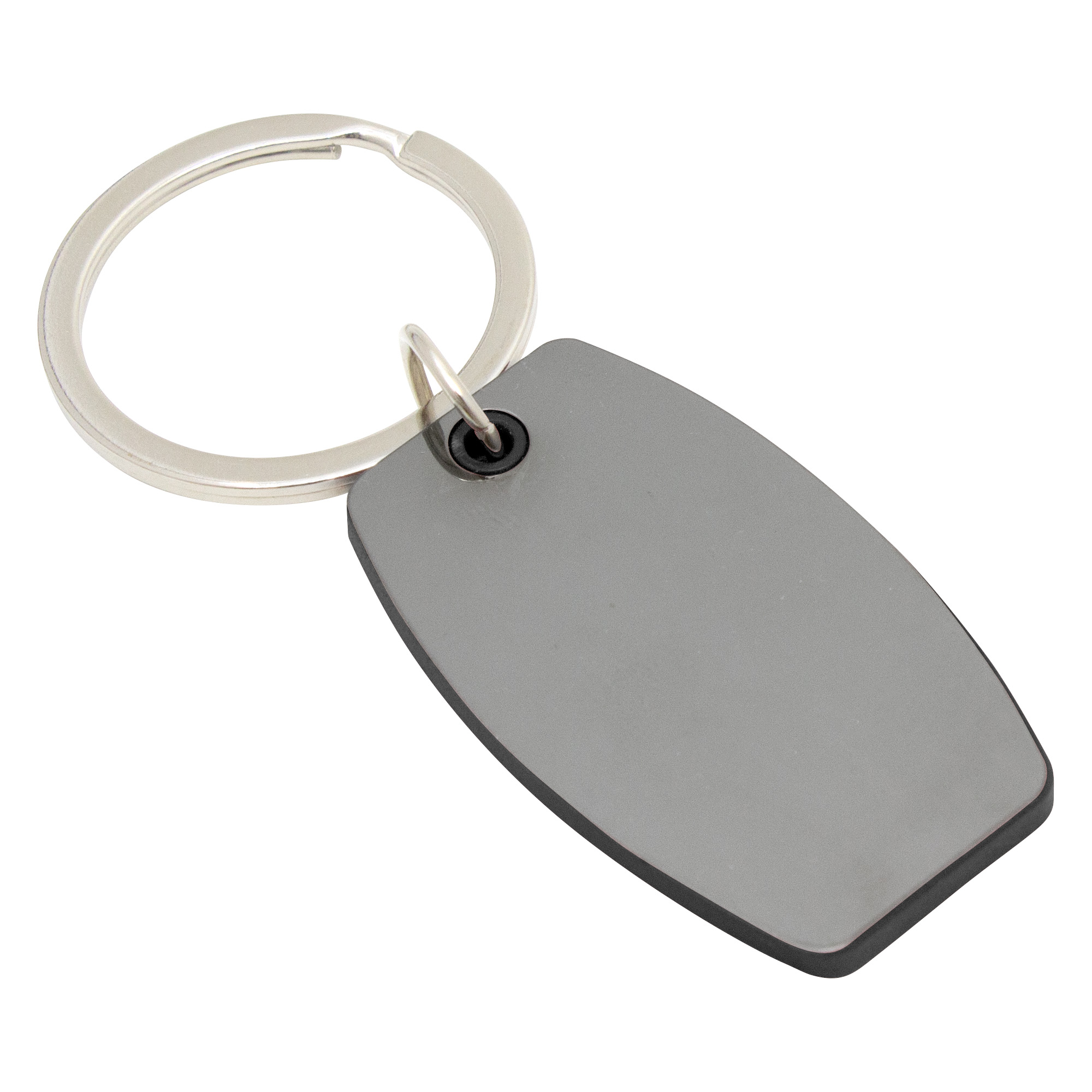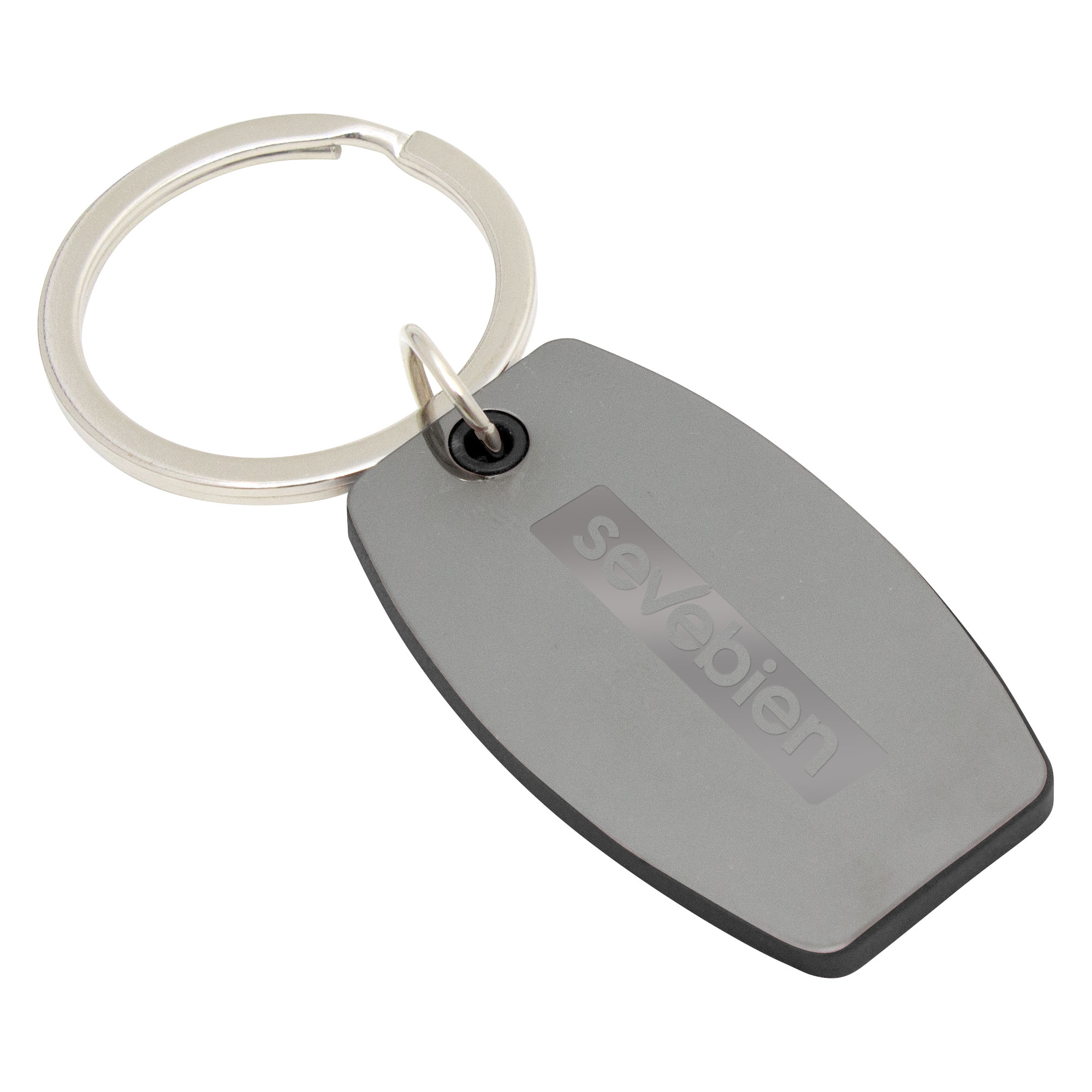 Refleja distinciónLlavero con forma ovalada. Estructura plástica de color con apliques de acero color gris gun de cada lado. Acabado brillante.Medidas: 5 x 3 x 0,35 cm. LLavero de Ø 3,5 cm x 0,2 cm.