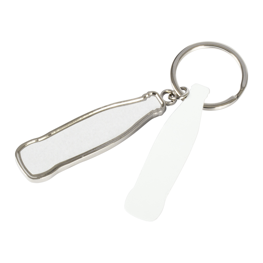 Llavero-destapador metálico con forma de botella de bebida gaseosa, para Sublimación. Incluye argolla llavero de Acero inoxidable. Presentación en estuche negro con cama aterciopelada negra.