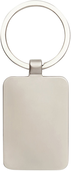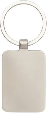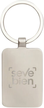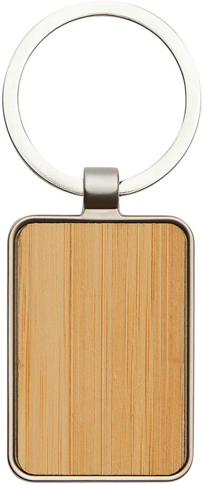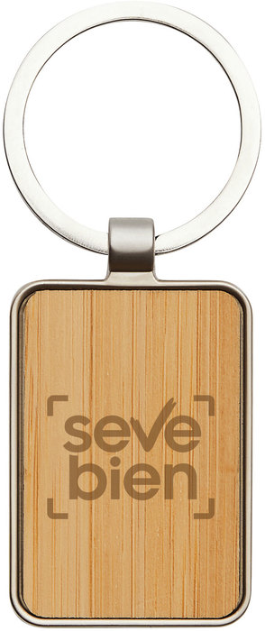 Llavero con forma rectangular. Estructura metálica con aleación de zinc con acabado brillante y panel frontal de bambú barnizado.
