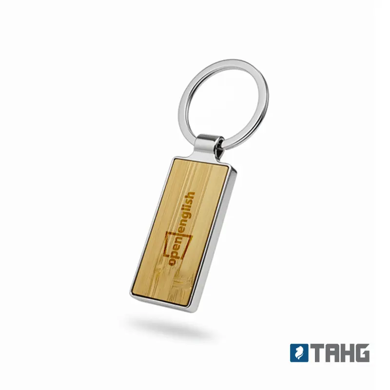 Llavero metálico con cara de bambú. Fabricado en aleación de zinc y bambú en color natural. Cuenta con anilla duradera y diseño alargado minimalista. Es ideal para merchandising ecológico, campañas publicitarias y uso diario.
