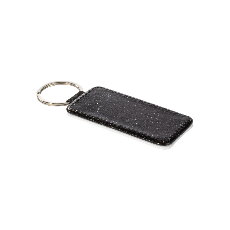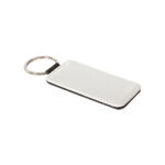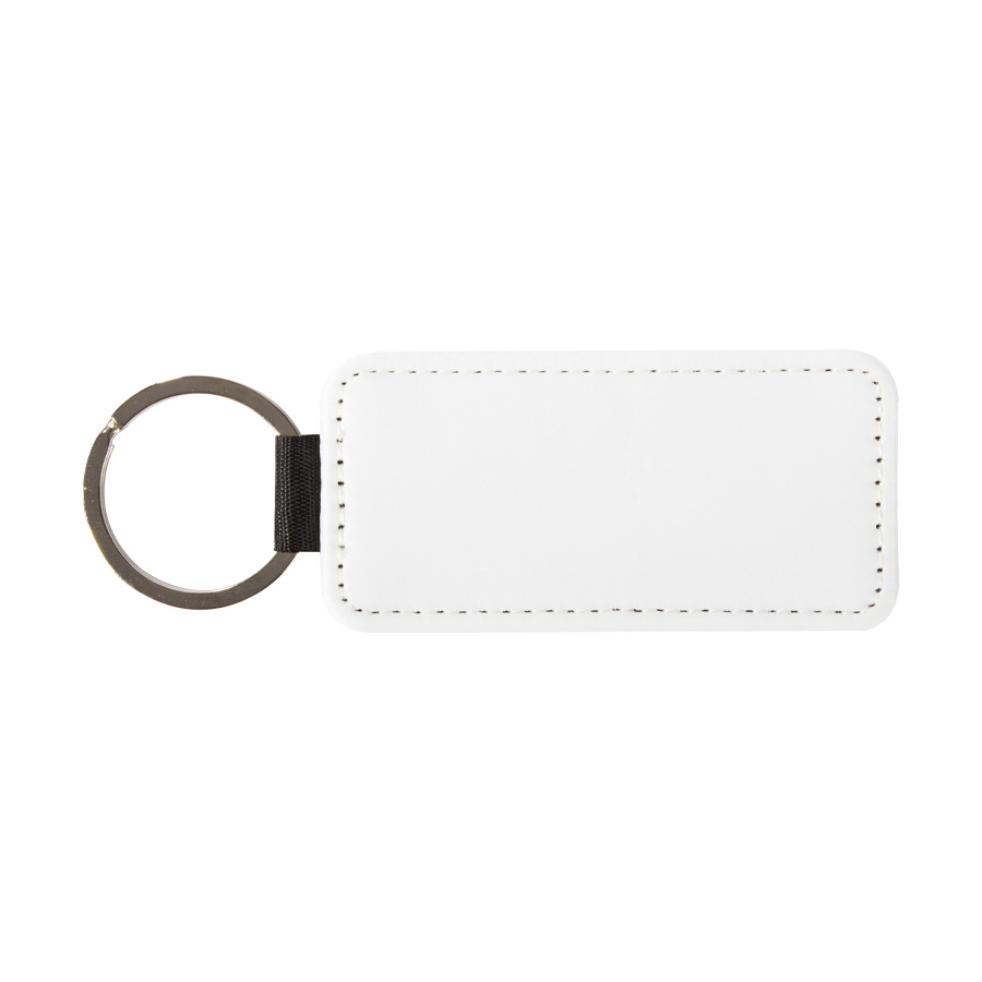 Llavero rectangular de PU blanco para sublimación. Reverso capa PU negro con brillo (no sublimable). Argolla de Acero inoxidable.