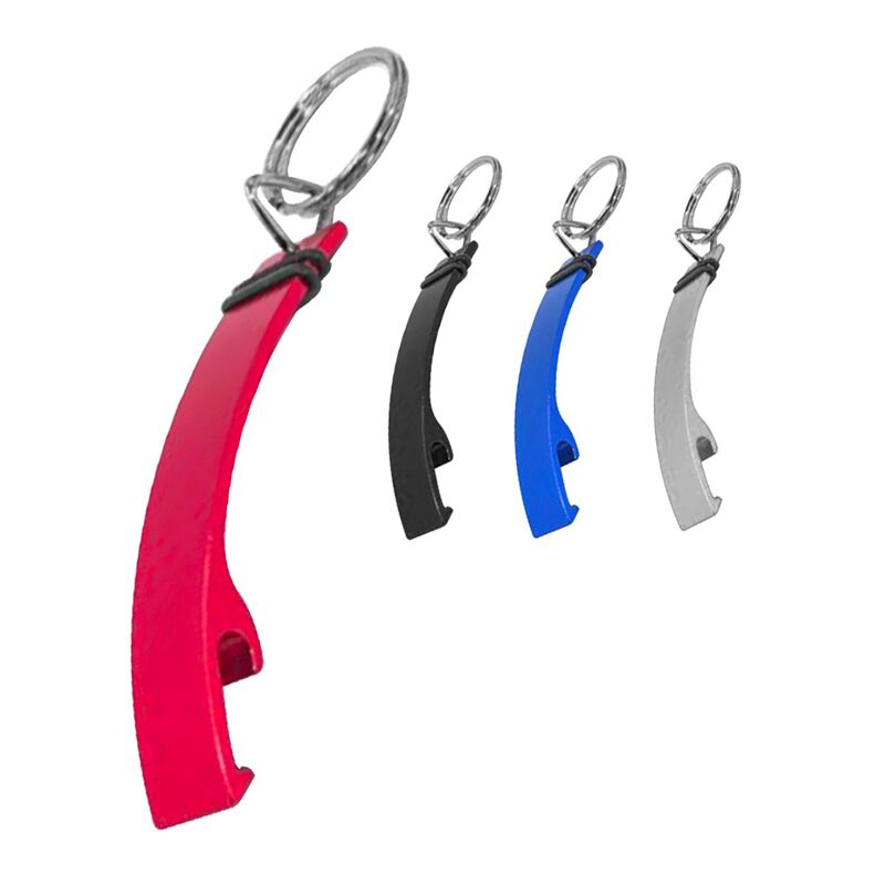 Llavero abrebotellas de metal con grip de goma antideslizante. Medidas: 1,5 x 7,9 x 1,2 cm. (anillo de 24 mm de diámetro). Tahg