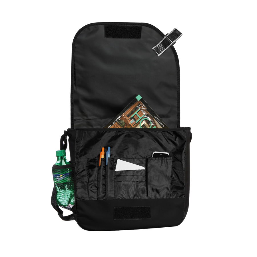 Maletín Portadocumentos de tela raquelada Polyester 600D modelo “Messenger”, con solapa delantera, organizador interior y salida para auriculares.