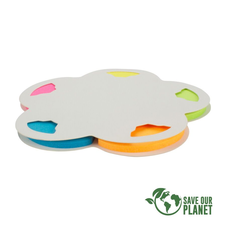 Memo set Ecológico con tapa y contra-tapa de cartulina blanca reciclada. Incluye 150 banderitas adhesivas de colores con forma de pétalo de flor.