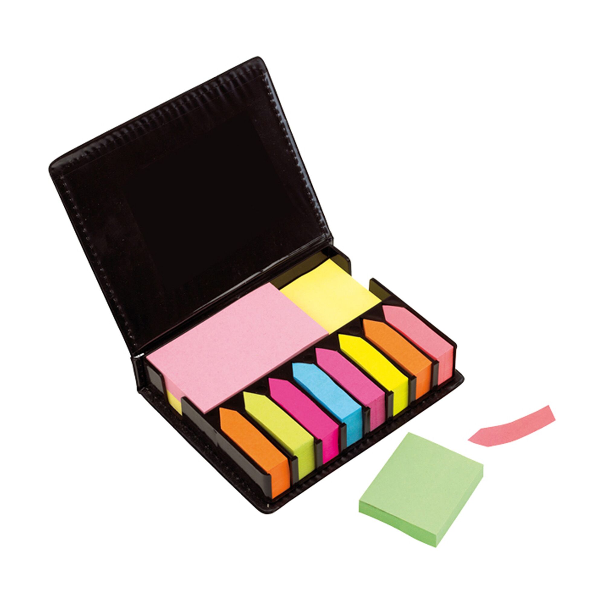 12,6 x 2,8 x 10,5 cm. Cuerina negra. 8 Blocks autoadhesivos de diferente color en forma de flecha. 2 Blocks autoadhesivos rectangulares de diferente color. 2 Blocks autodhesivos cuadrados de diferente color.