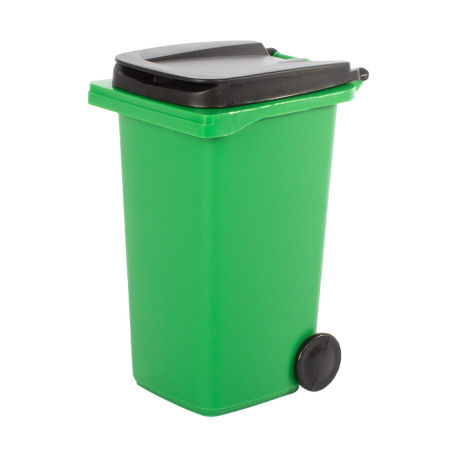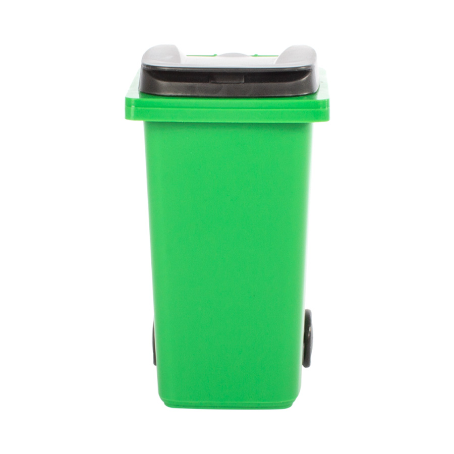 Mini Basurero Verde de Sobremesa plástico verde, con tapa y ruedas negras.