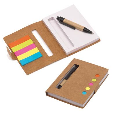 10,5 x 7,8 x 1,1 cm. Cartón. Material reciclado. 80 hojas lisas blancas. 5 blocks autoadhesivos rectangulares de diferentes colores. 1 bolígrafo de pasta negra.