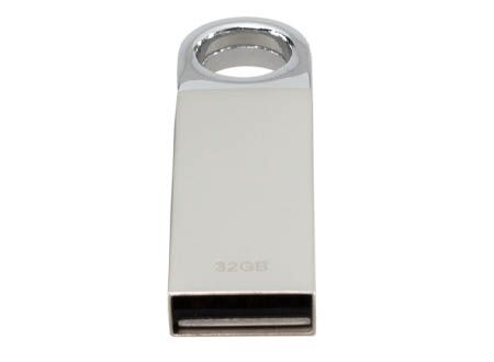 Mini-Pendrive USB 2.0 con 32GB de memoria, cuerpo metálico y espacio redondo para colgar. Presentación en práctico blister de cartón reciclado con ranura para ganchera, y estuche plástico translúcido para remover el pendrive directamente.