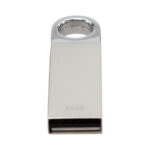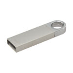 Mini – USB Pendrive USB 2.0 con 32GB de memoria, cuerpo metálico y espacio redondo para colgar. Presentación en práctico blister de cartón reciclado con ranura para ganchera, y estuche plástico translúcido para remover el pendrive directamente.