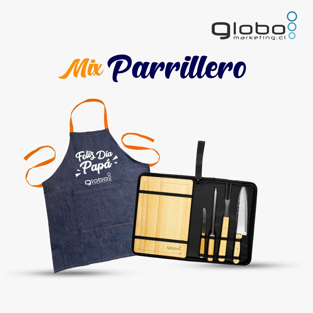 23 x 35,5 x 4,2 cm. Poliéster 300D, madera y acero inoxidable. Set de asado de 5 piezas: Tabla de madera 32,5 x 21,5 x 1,1 cm. Tenedor asador, cuchilla, cuchillo y chaira para afilar, todo con mango de madera barnizados.