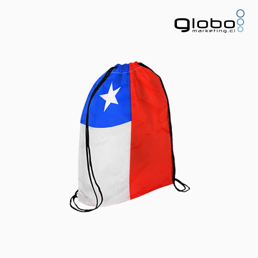 Mochila “Flag” de poliéster 210D/PU, tipo Morral. Incluye gráfica de Bandera chilena por el anverso y por el reverso es 100% blanca, ideal para impresión de logo.
