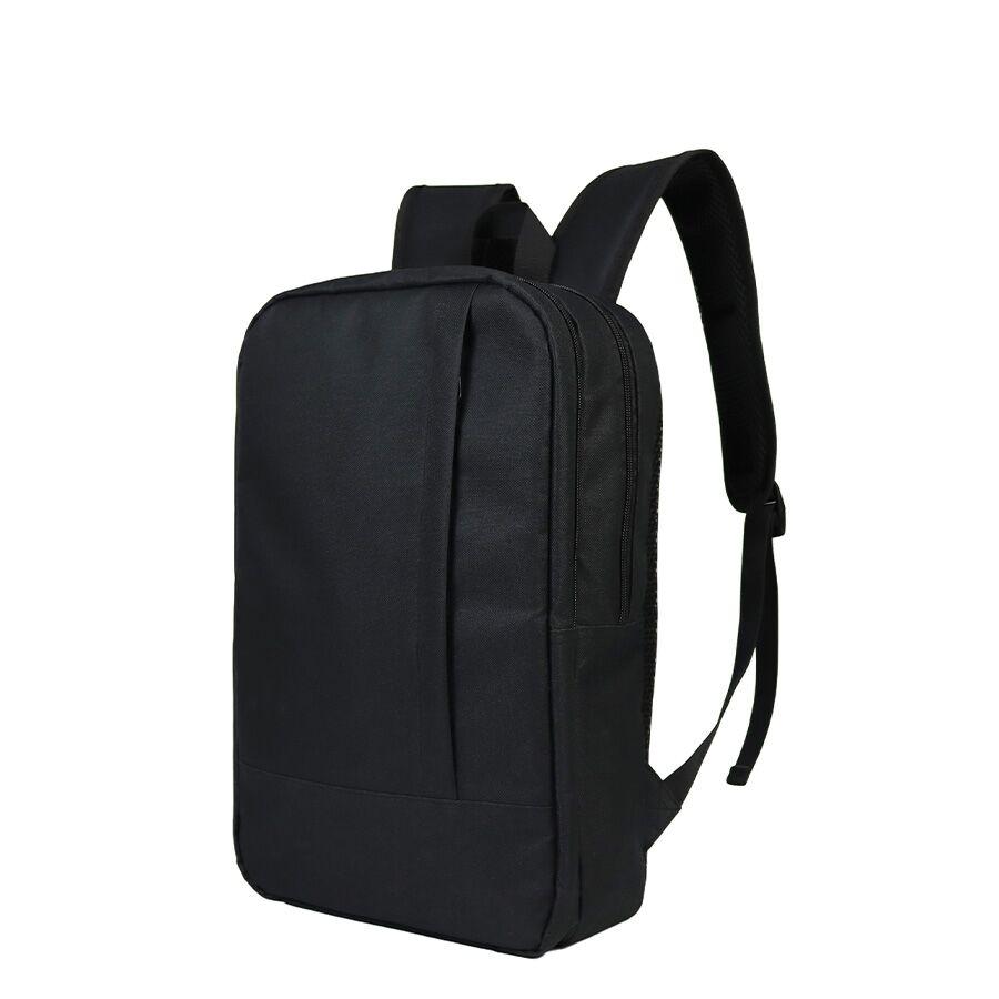 Mochila Porta-Notebook modelo “FORT”. Fabricada en tela poliéster 600D/PVC. Capacidad 14 litros, tamaño 28 x 42 x 12 cm. Contiene 2 compartimentos interiores forrados en nylon, cuerpo completo: uno posterior (de seguridad) y otro central, ambos reforzados y acolchados, además de 2 compartimentos (bolsillo) delantero con cierre cremallera lateral. Espalda acolchada con red de ventilación.