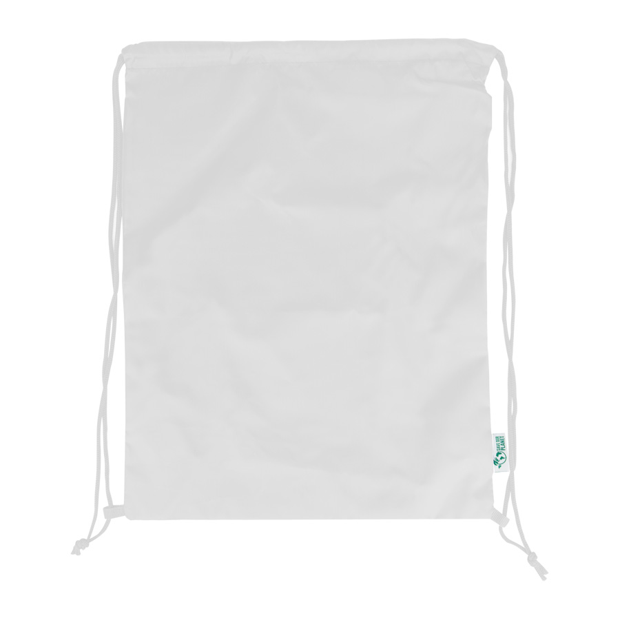 Mochila tipo Morral, fabricada en tela reciclada RPET, con tiras de cordón también el tela reciclada RPET .