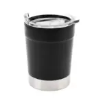 Mug térmico realizado en acero inoxidable en su exterior, y polipropileno de color negro en su interior, con tapa transparente cristal clear con cierre. Producto libre de BPA. Interior realizado en plástico. Medidas: 12 cm x Diámetro 8.5 cm. Capacidad: 360 ml