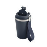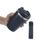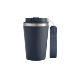 Mug doble pared con asa colgante. Interior de acero inoxidable 304 y exterior de Polipropileno con acabado mate. Tapa a rosca de polipropileno con anillo de silicona y seguro antiderrame del mismo color del mug. Asa de poliuretano y poliéster.