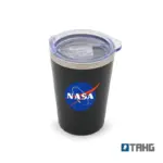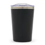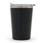 Mug fabricado en acero inoxidable color negro, con tapa antiderrame de acrilonitrilo estireno, garantizando resistencia y durabilidad.